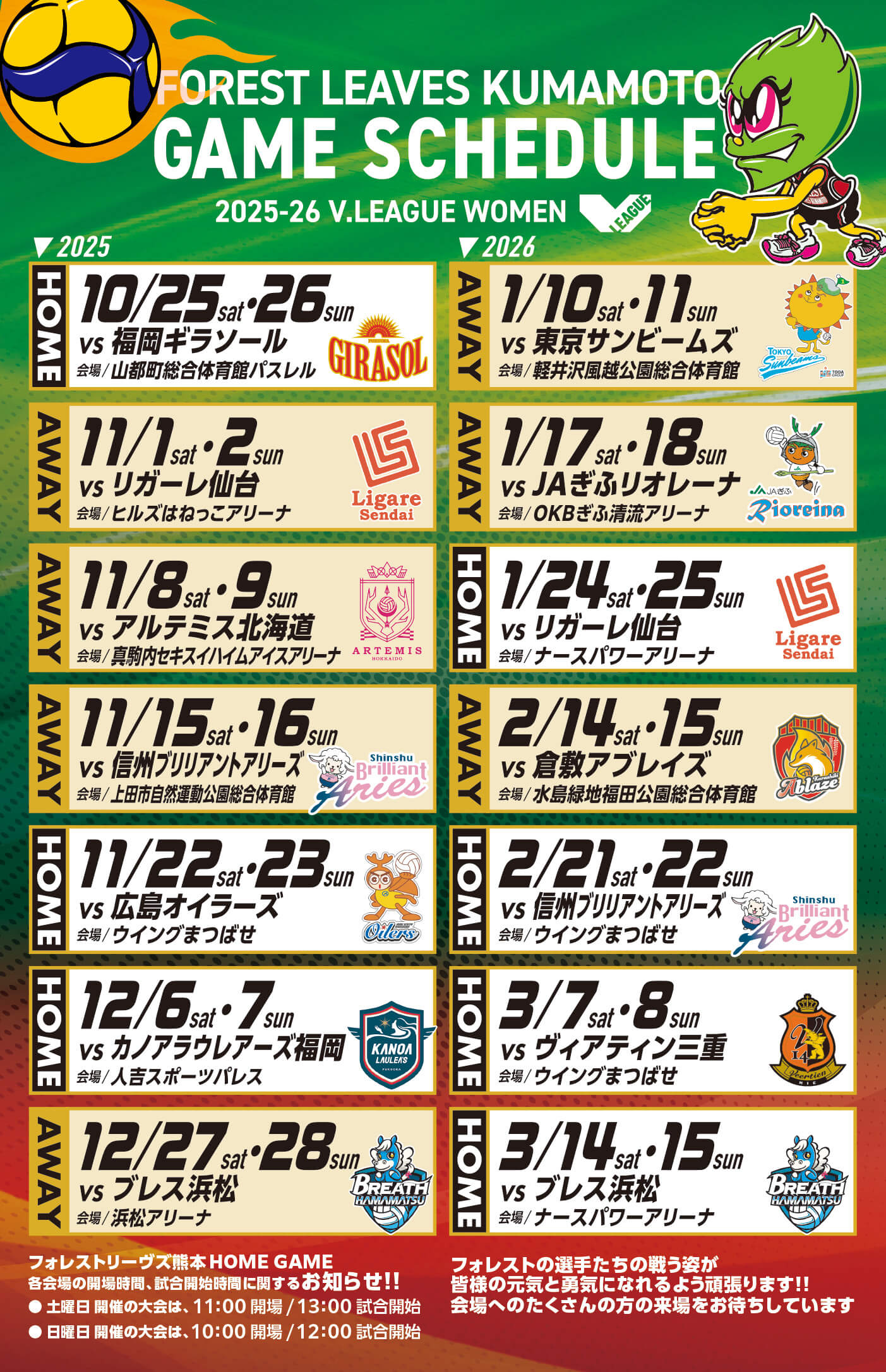 日頃よりフォレストリーヴズ熊本を応援いただき誠にありがとうございます。 2025-26 V.LEAGUE WOMENの試合日程が決定しましたのでお知らせいたします。 2025-26シーズンも熱い応援をよろしくお願いいたします。